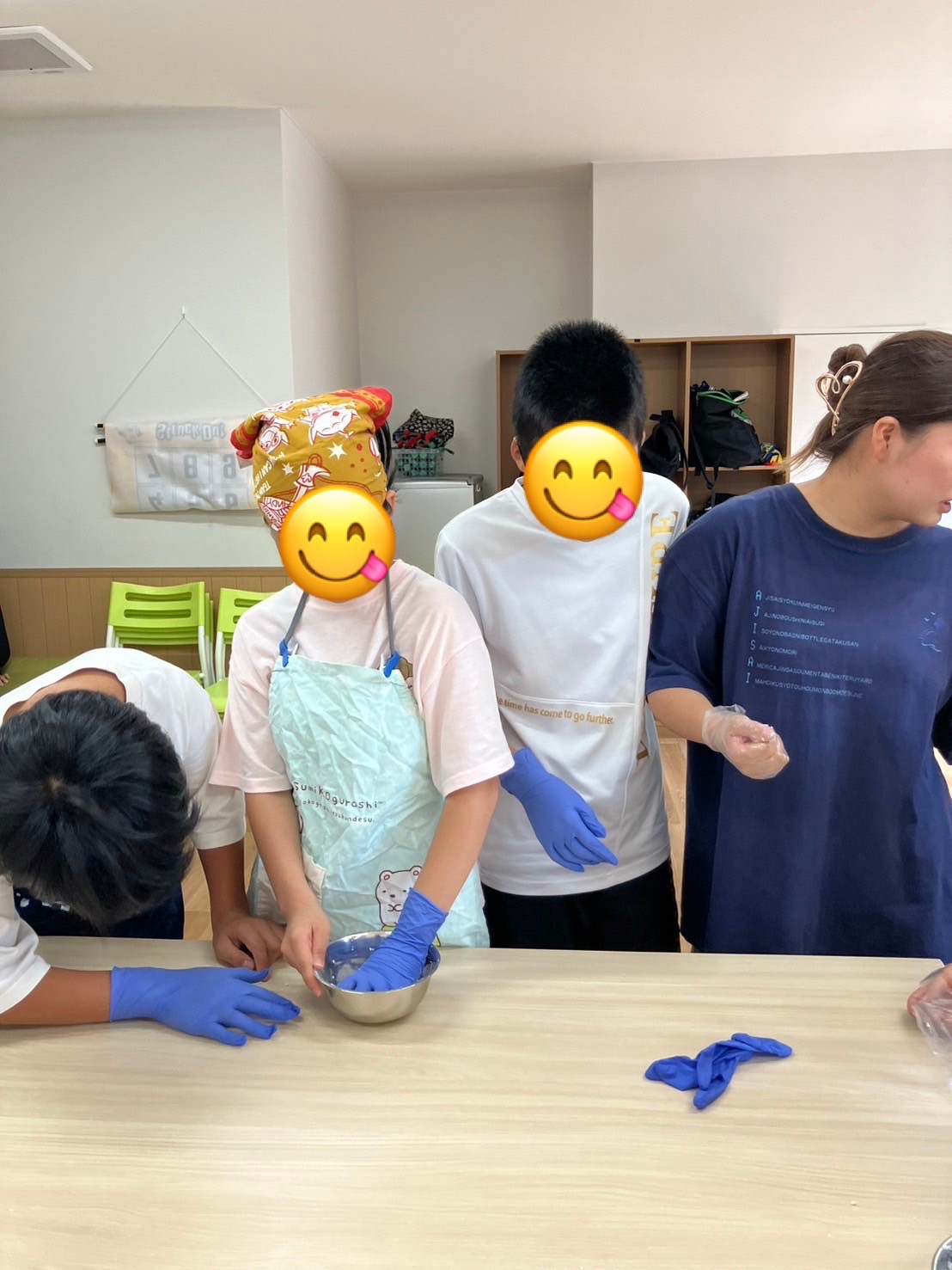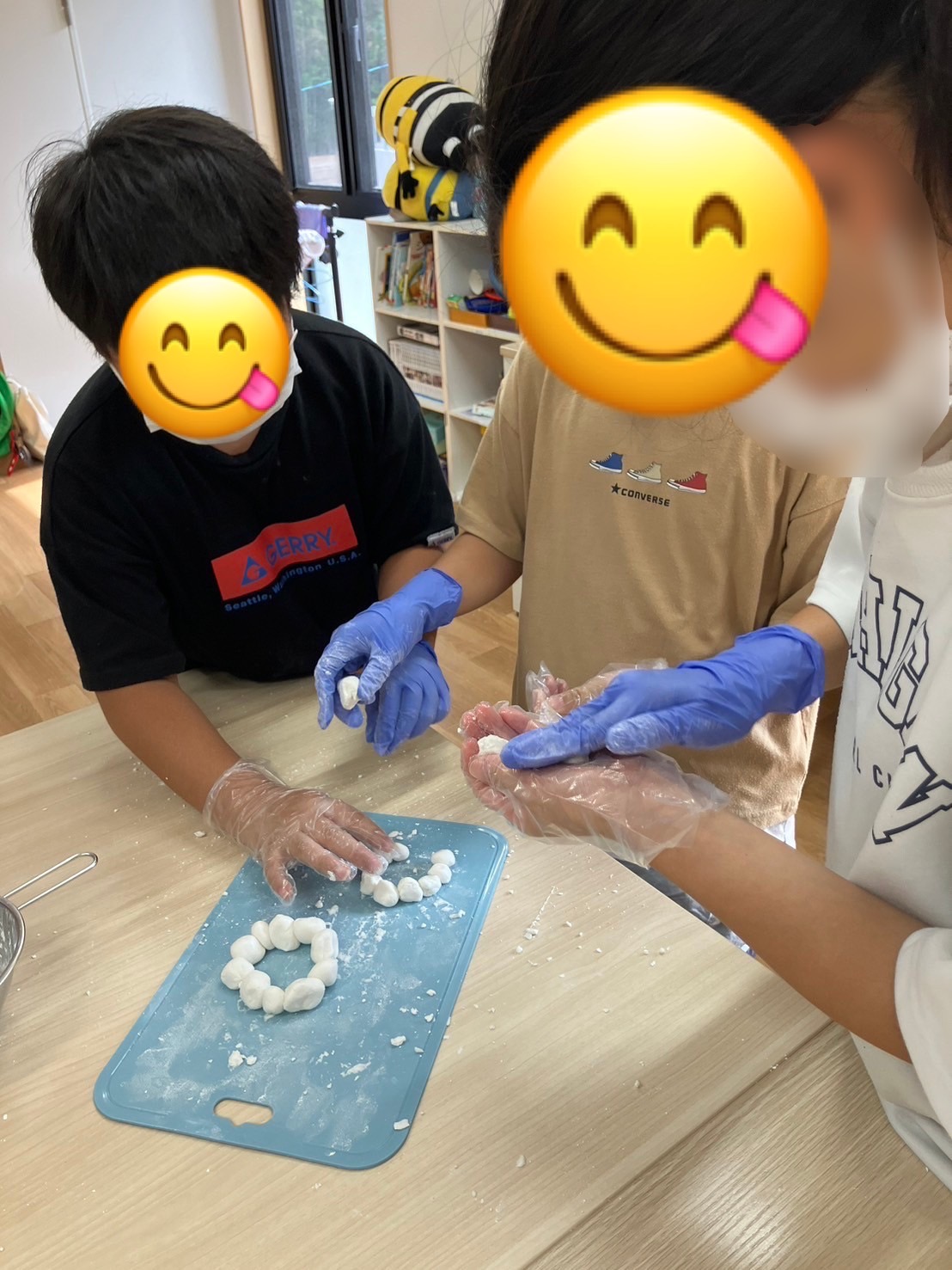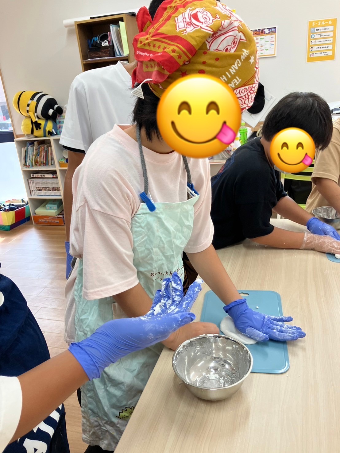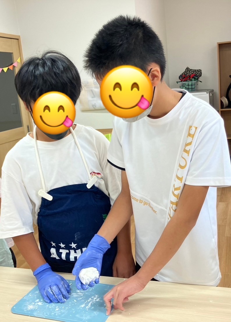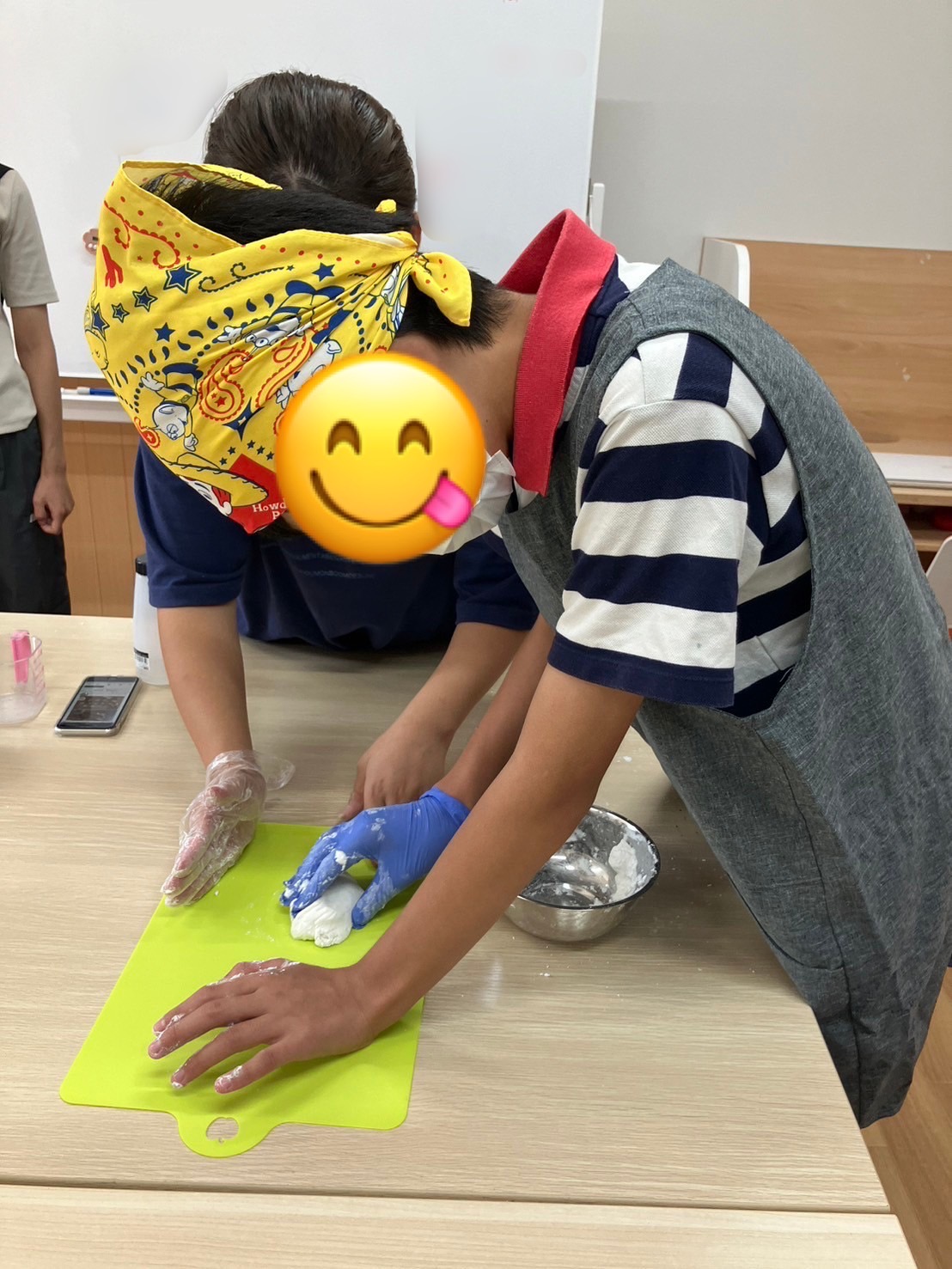 粉から混ぜる担当をした子達は中々まとまらず「難しい!」との声もきこえましたが、同じ班の子と交代もしながらこねあげることができました👏🏻✨