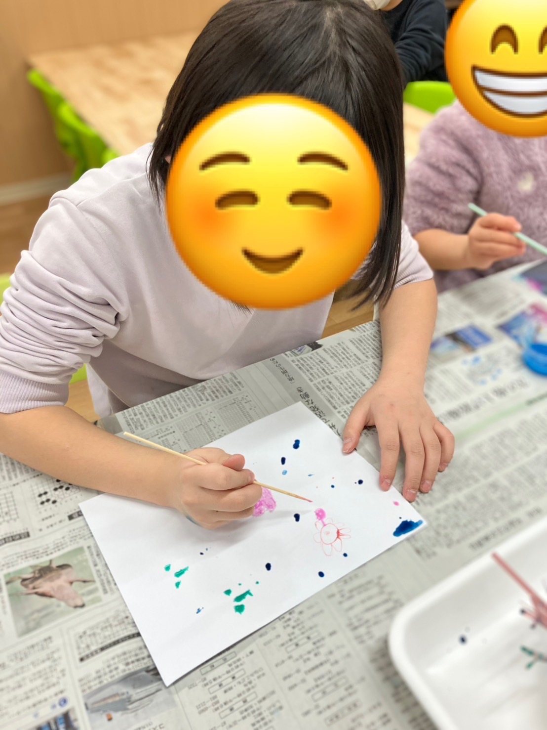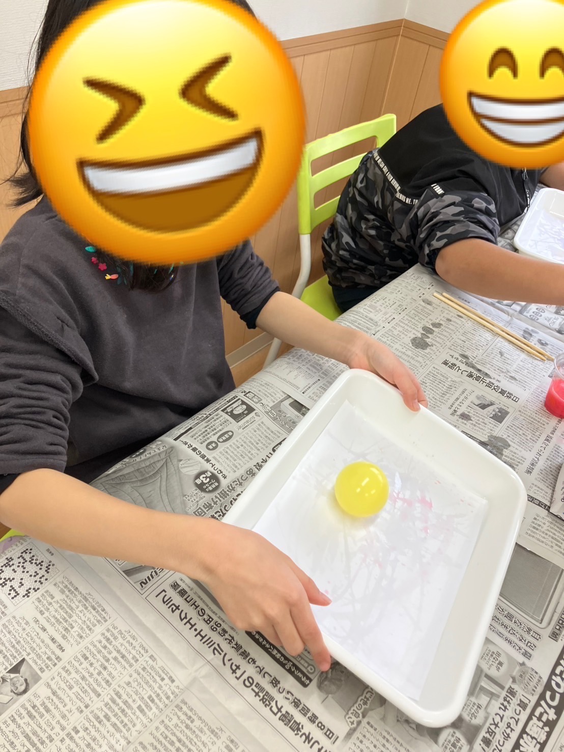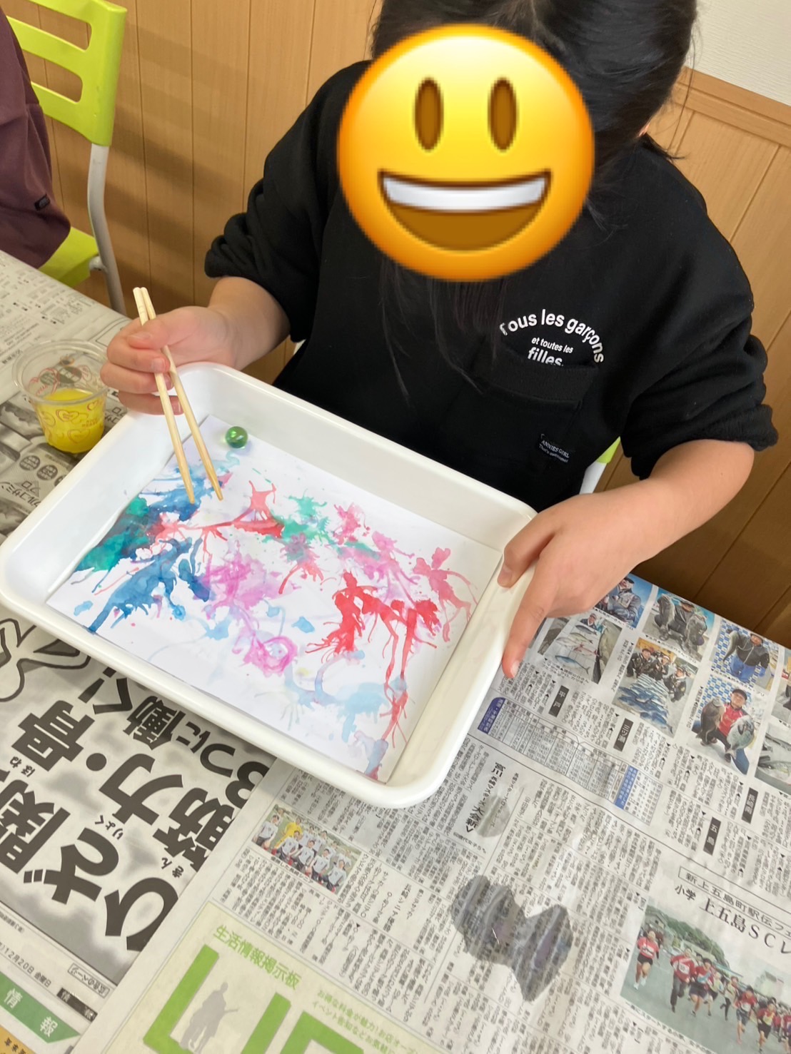 ビー玉・ボールなどトレイの上で転がして色をつけたり、自分の指で描いた児童もいました👀🍀普段絶対に使わないものでも絵を描ける楽しさ、それぞれがもつ特徴がわかる活動となりました♪
