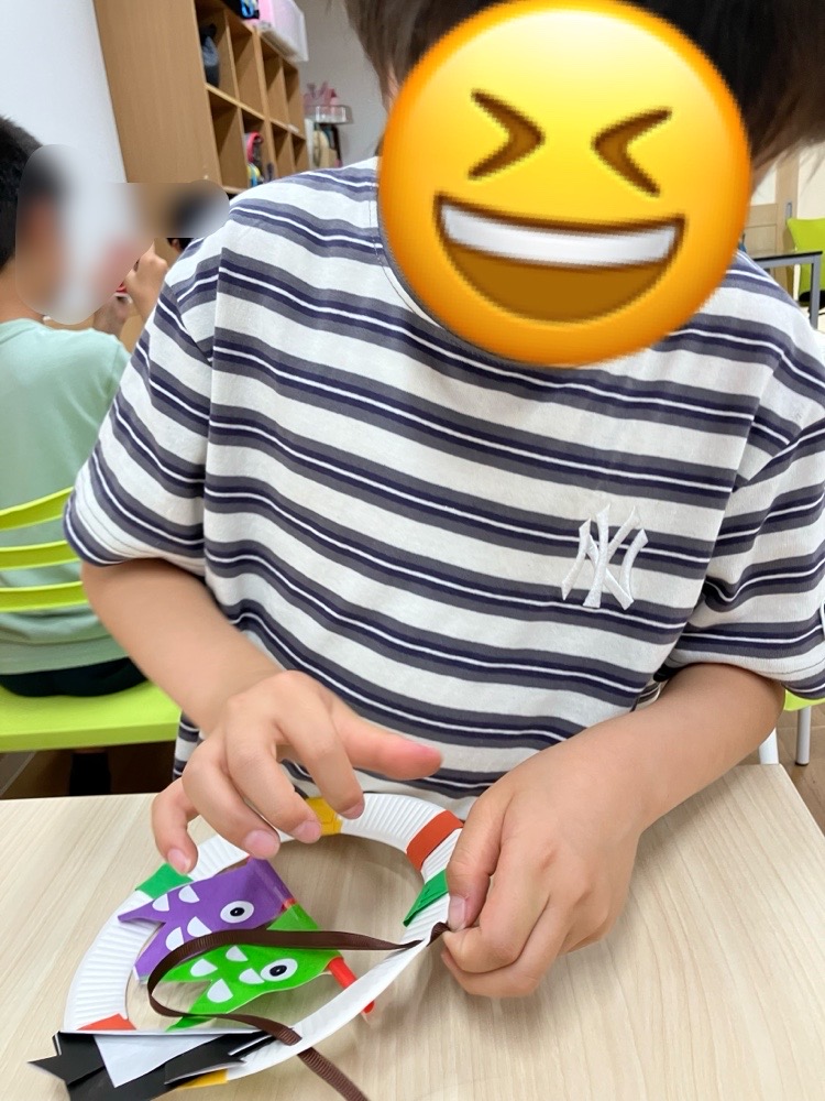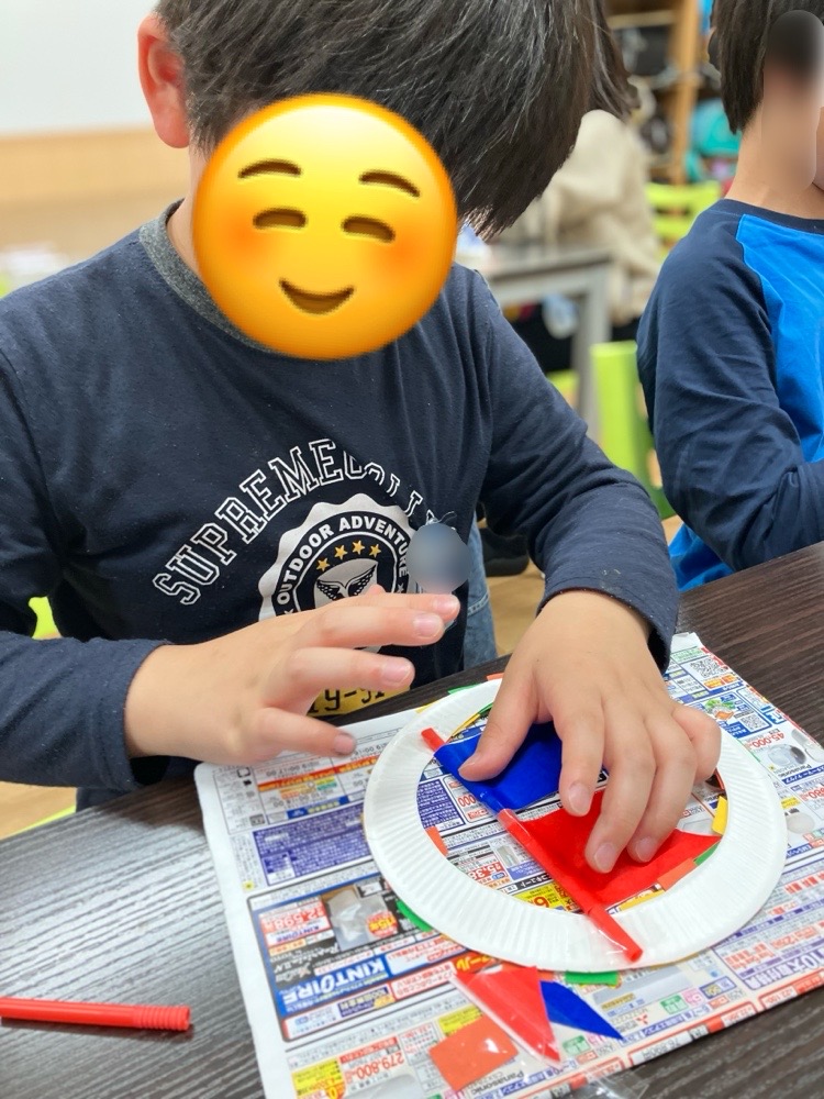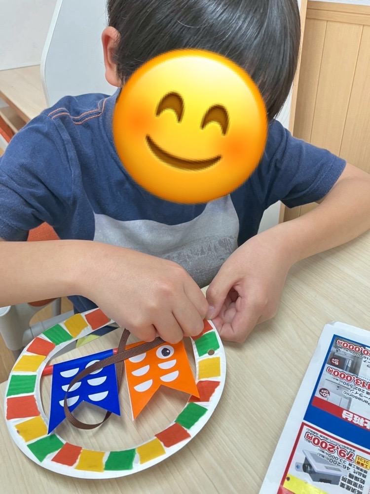 折り紙で兜を折ったり、糊付け、ハサミ、紐通しなど様々な工程がありましたが最後まで頑張って作りあげることができました☺️