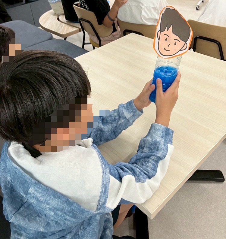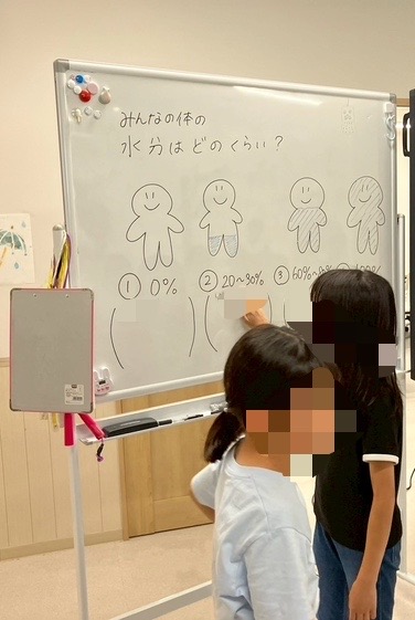 皆の体には、どのくらい水分があるのかクイズで尋ねたところ『0%』や『100%』を選ぶ子も中にはいましたが、実験を通してどのくらい水分が入っているのか学ぶことができました。