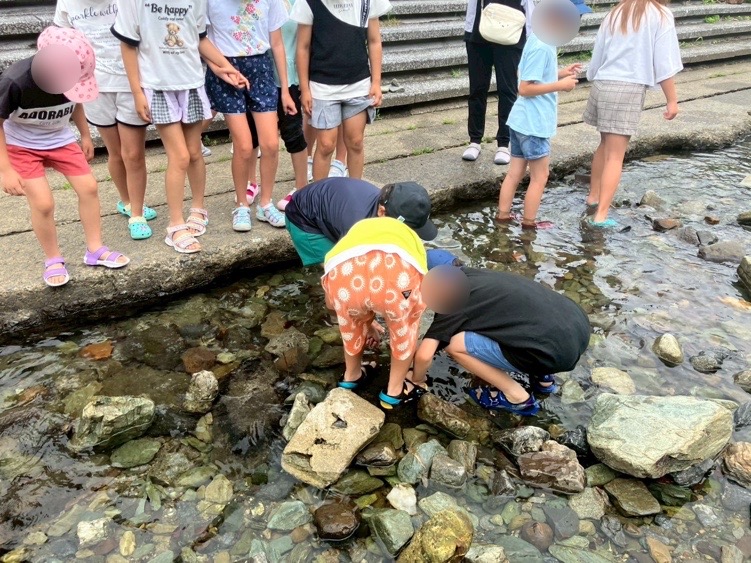 子ども達は恐る恐る足を水につけ、それぞれに魚やエビを探したり、貝を集めたり、虫を捕まえたりと夢中になって楽しむ姿が見られております✨