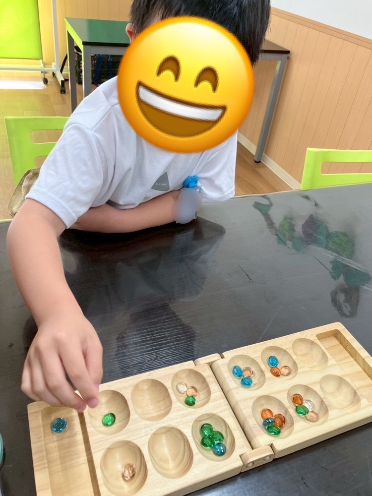 本日の活動は、マンカラ遊びに取り組んでおります😊✨なかなか難しいルールでしたが、ルールを理解できたお友達が分からないお友達にもアドバイスをあげたりしながらみんなで楽しんで取り組むことができました⭐️