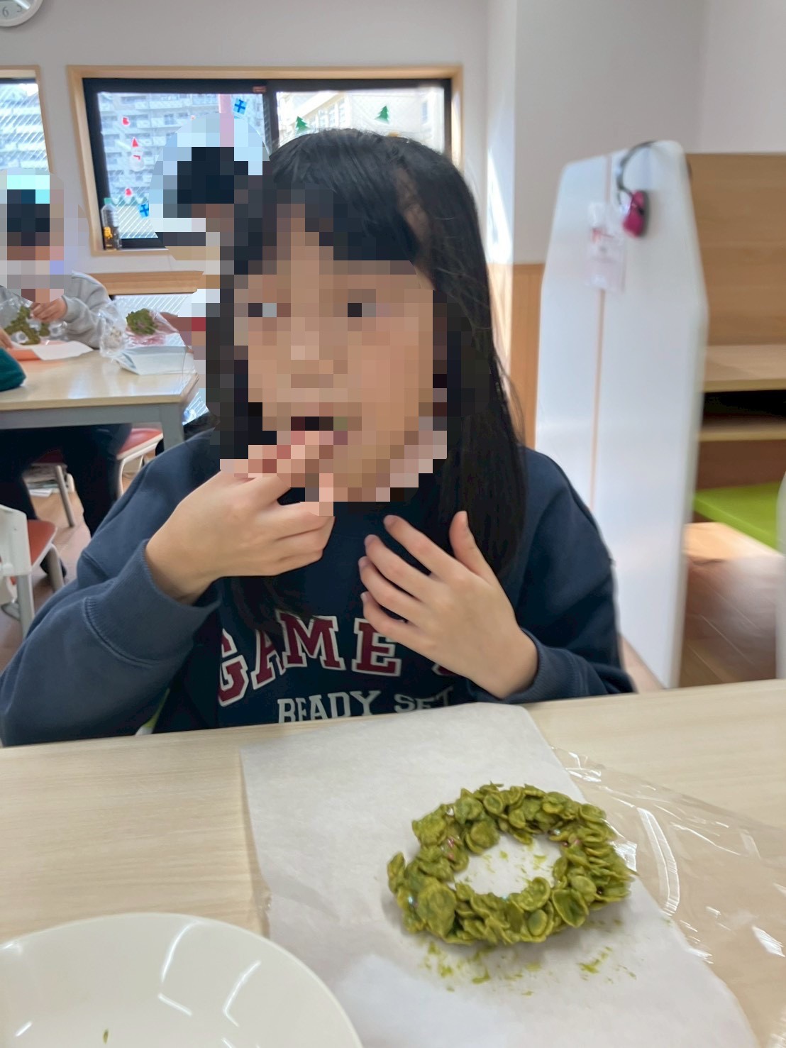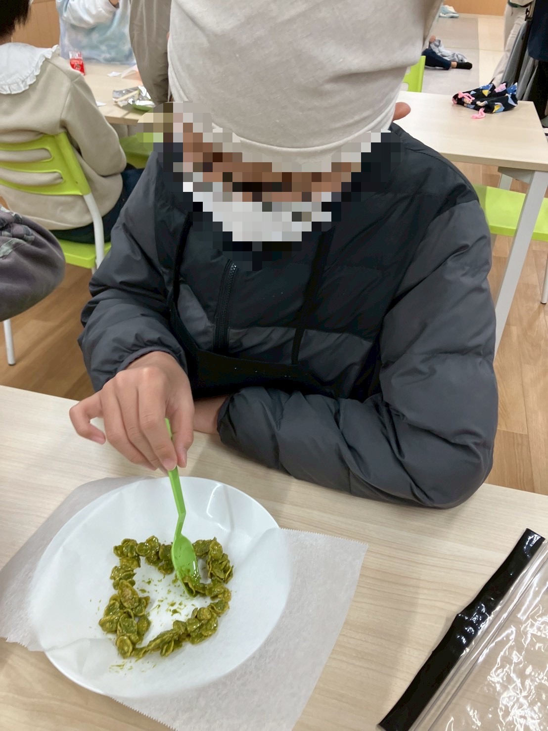 最後に自分が食べる分を1人ずつお箸等を使いながら、リースのように輪っかに作って、トッピングし、巧緻性の向上にもつながりました👌