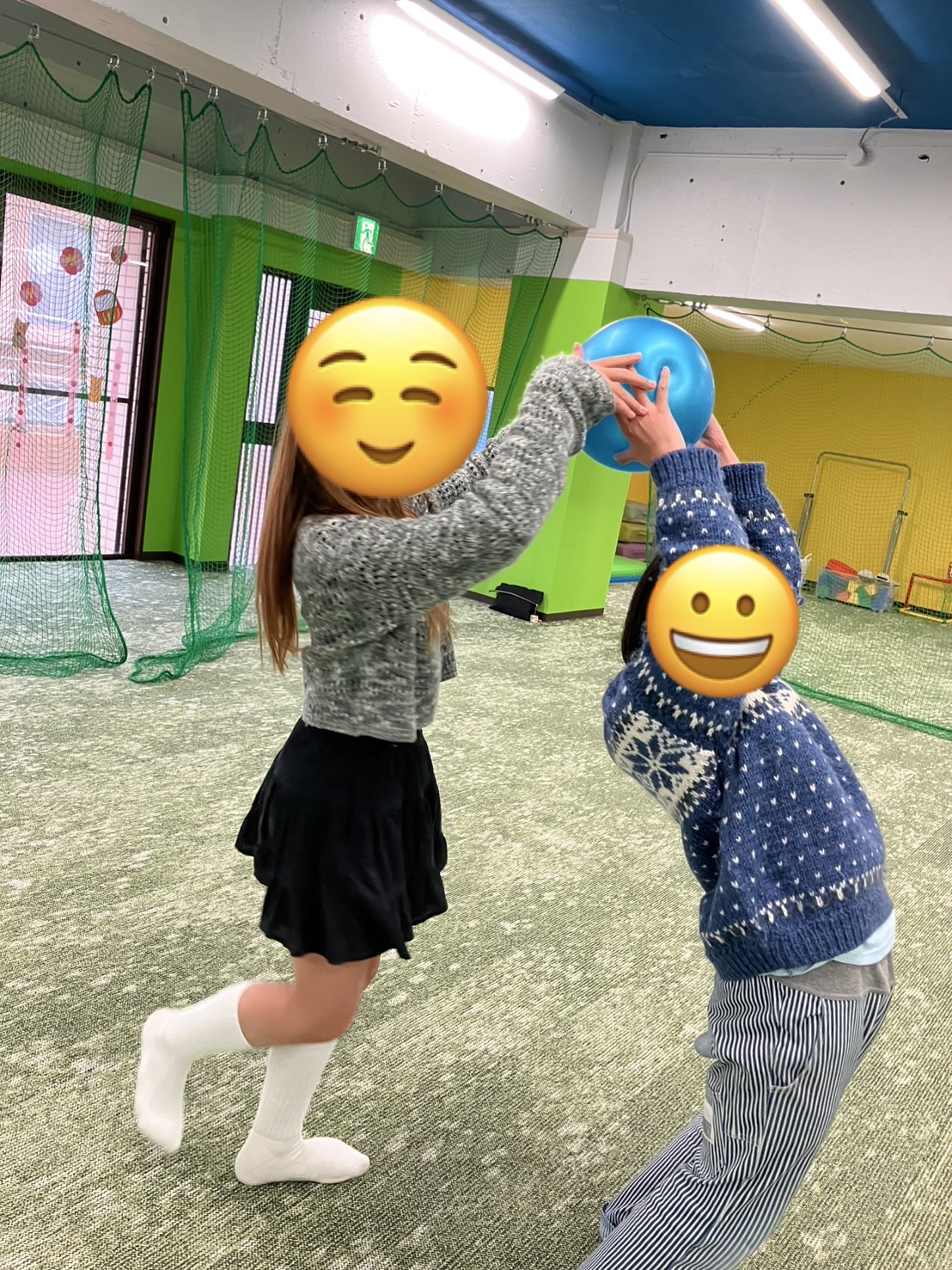 2人1組で一列に並び、前の人はボールを頭の上から後ろの人に渡し、前にいた人は後ろに行き後ろにいた人の股の間から渡されたボールをもらうということを繰り返すもので、上下の空間認識を育てたり、協調性や体感を養う内容になっております✨