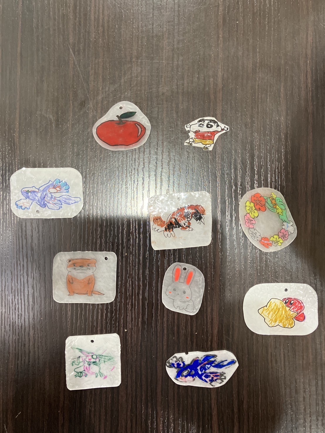 好きなキャラクターや動物を、ペンや色鉛筆を使って、プラスチックの板に描き、トースターで焼くことで、キーホルダーを完成させることができました✨