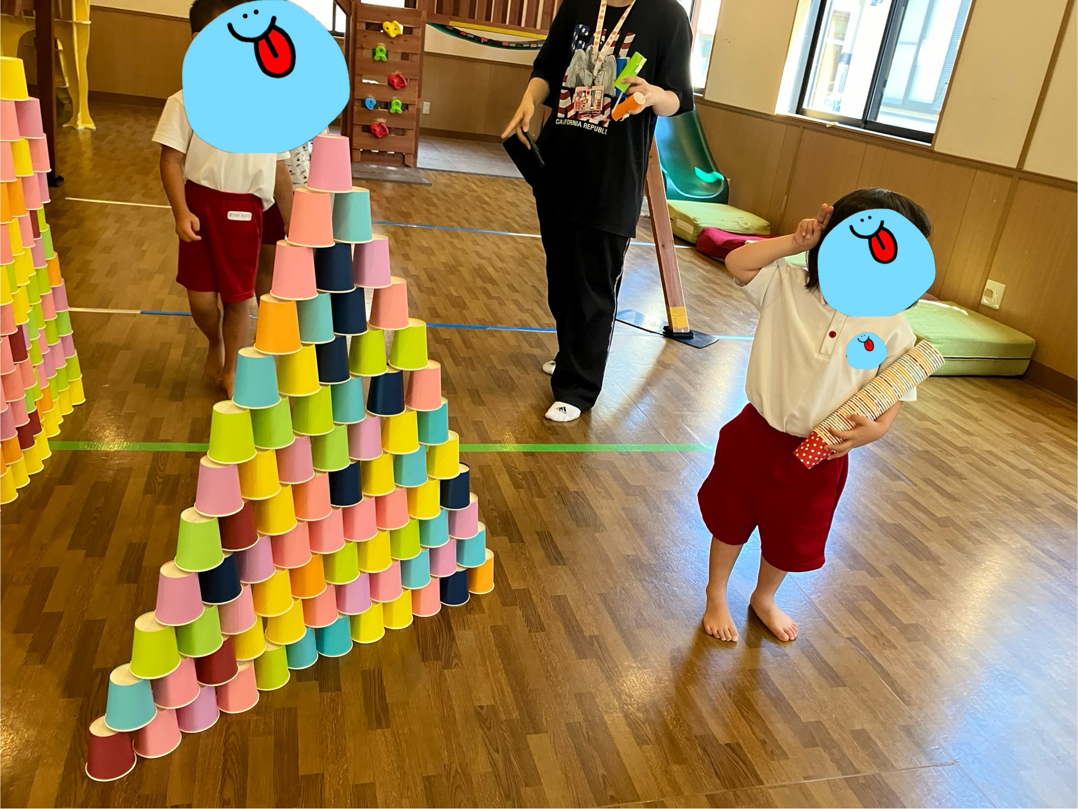紙コップをお友達と協力して高く積み上げたり、色ごとに分けて並べたりして活動を行っています。 その後は積み上げた紙コップを、トイレットペーパーで作った射的の銃で倒して楽しみました。