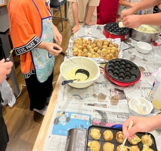 野菜やタコの中に入れる具材を切る係、混ぜる係、焼く係にそれぞれ分かれてもらい、任された仕事にしっかり取り組んで美味しいたこ焼きを作ることができました✨
