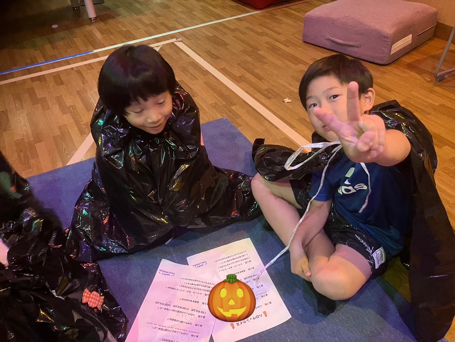 事前に作った創作余暇で作ったマントをつけて、土曜行事で作ったお菓子入れのバッグなどを手に、3つのブースを回ってお題にチャレンジしました✨