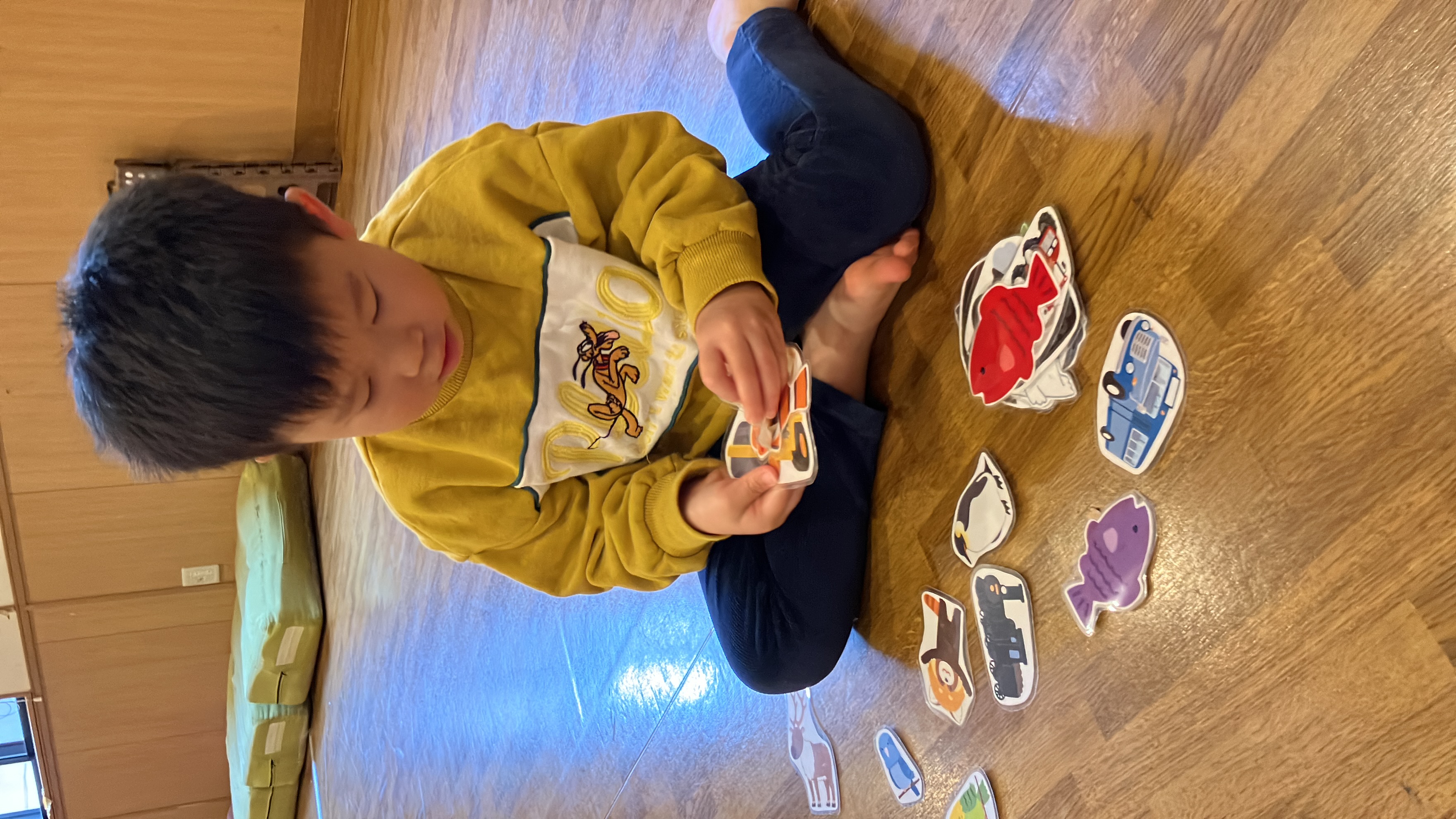 お魚、動物、乗り物のシールを壁に貼り、子どもたちが探して種類ごとに分けたり色ごとに分けてもらいました✨