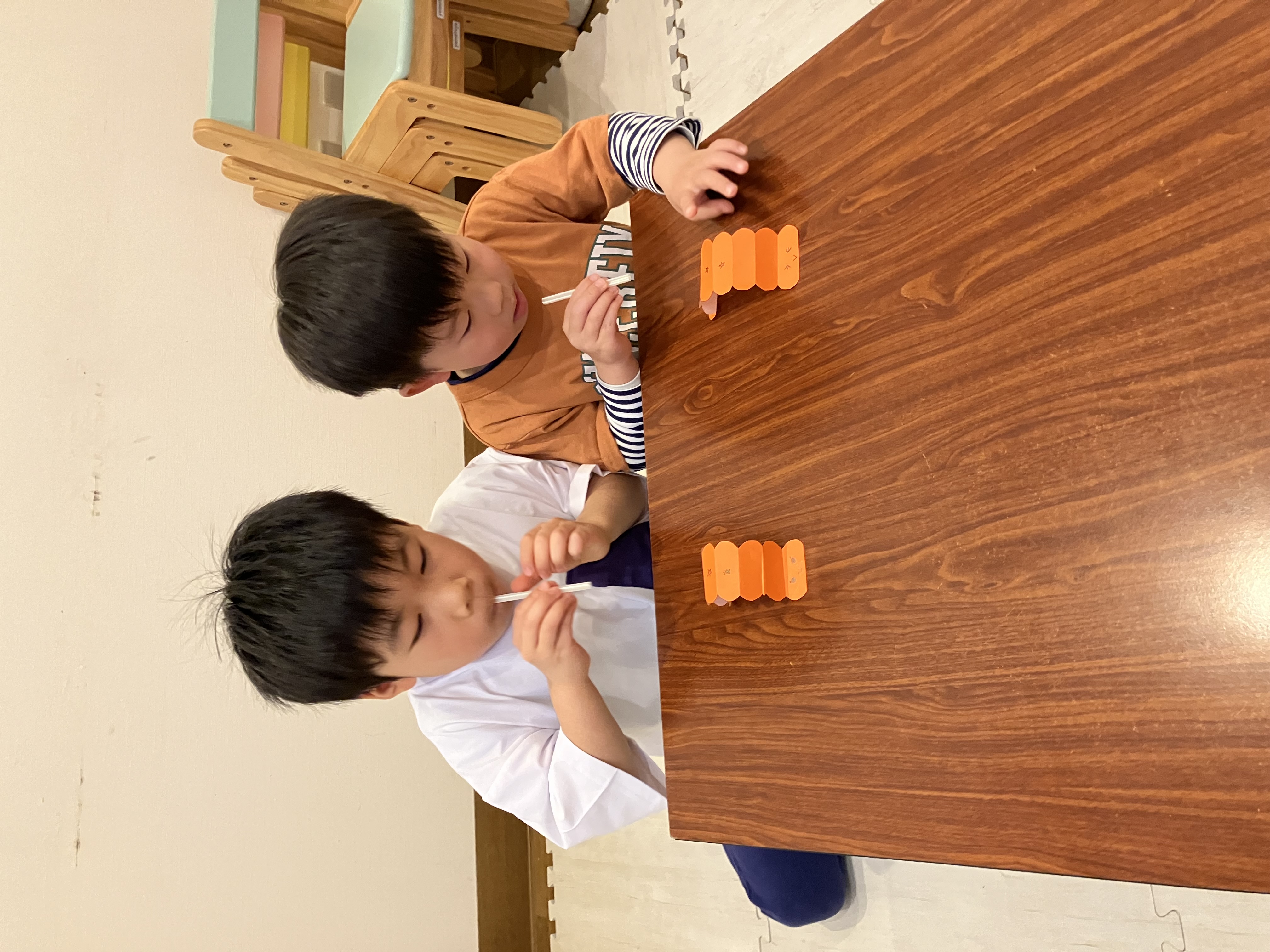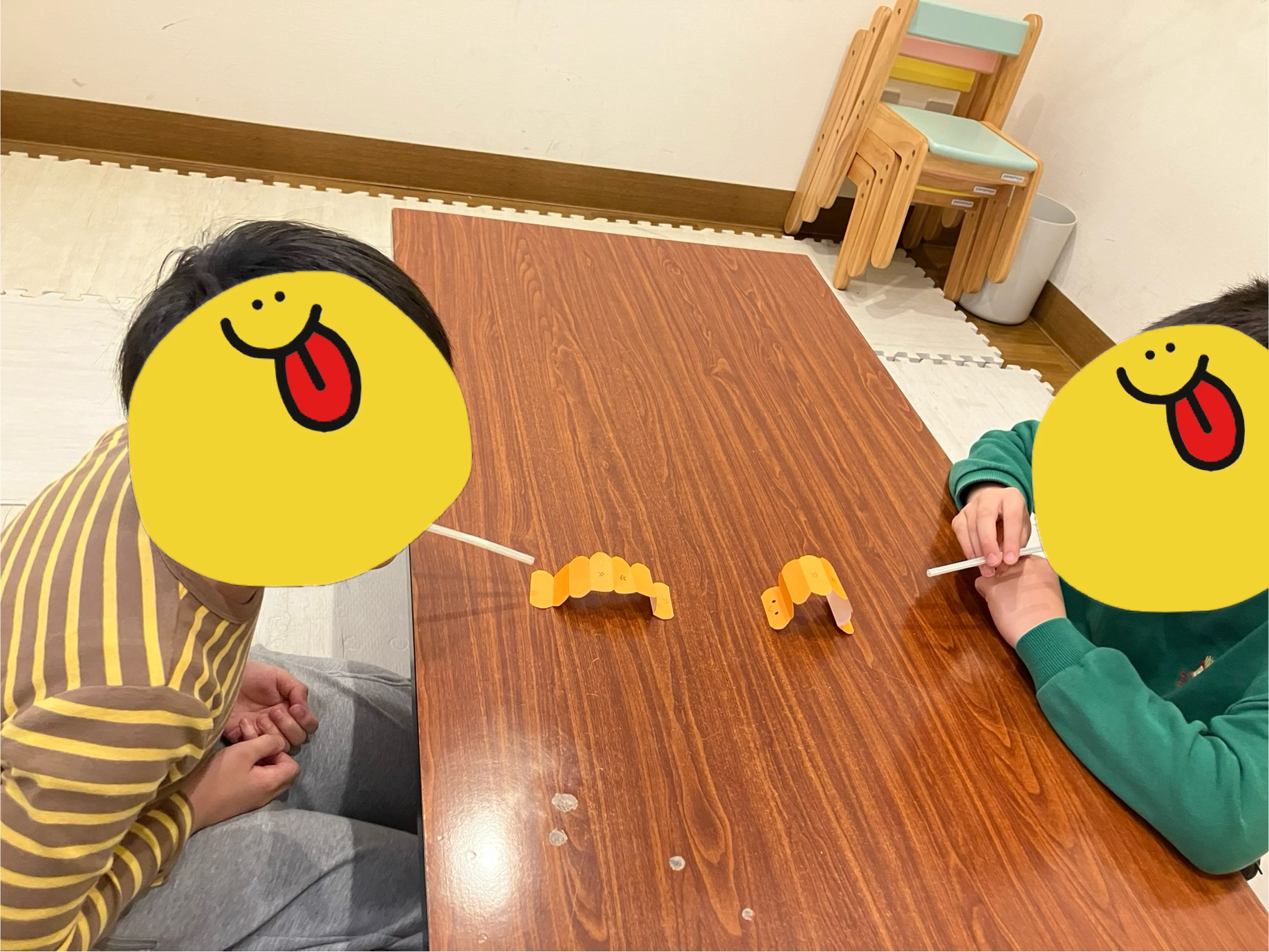 折り紙のいもむしをストローから吹く息で進めるレースになります。