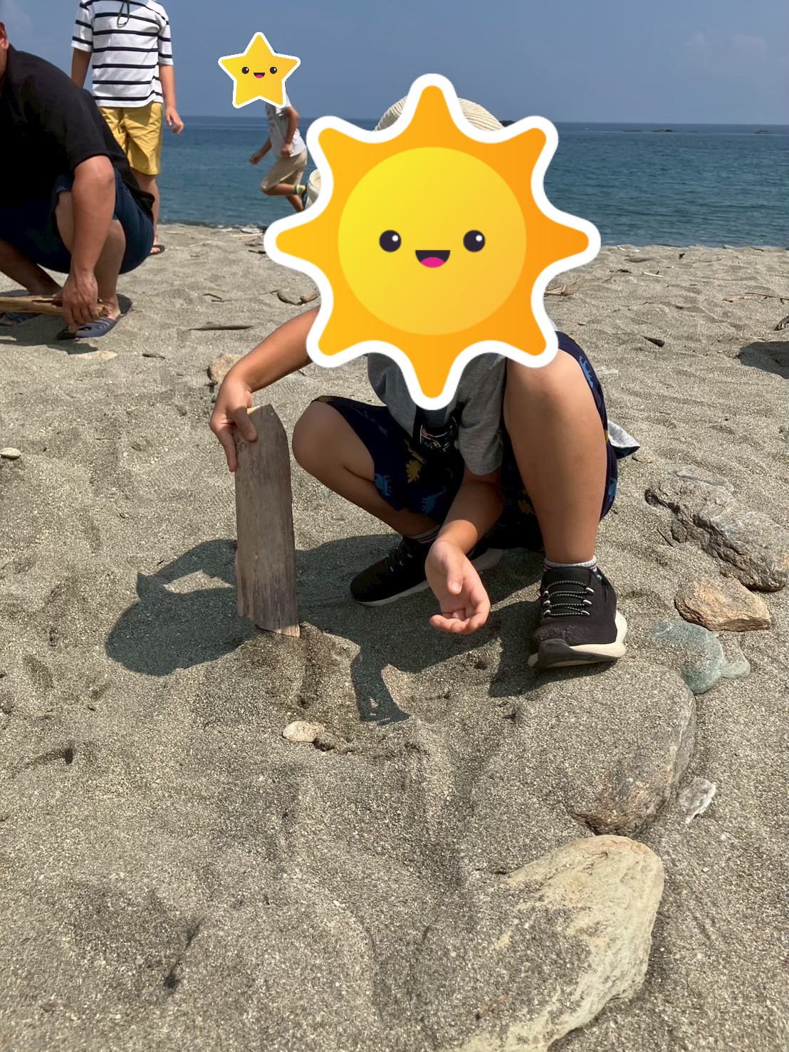 宝物は砂浜の中に埋めており、子どもたちは「どこにあるかな?」「ここを掘ってみよう!」と声を掛け合いながら一生懸命に探していました☻