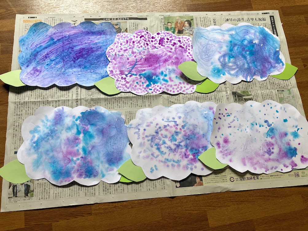今回は「にじみ絵」を用いてあじさいの壁面を作りました。