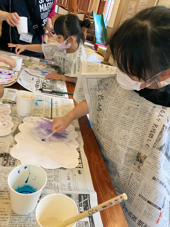 絵の具がにじんでいく様子を見て、「ワーってなってる!」と言ったり、絵の具が混ざり色が変わる様子を見て「きれい!」と言ったりする子どもたちの姿が見られました