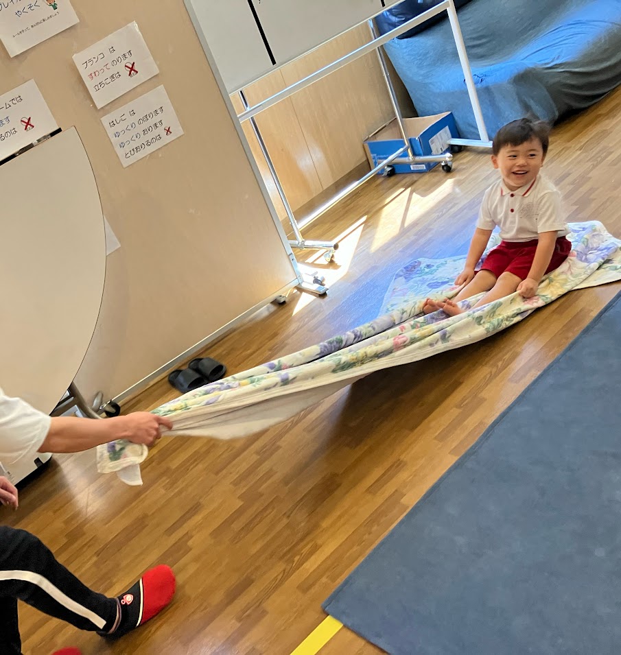 このほかにも、タオルをゆりかごのようにしてゆらゆら揺らす遊びも行い、みんな気持ち良さそうにしておりました🐥