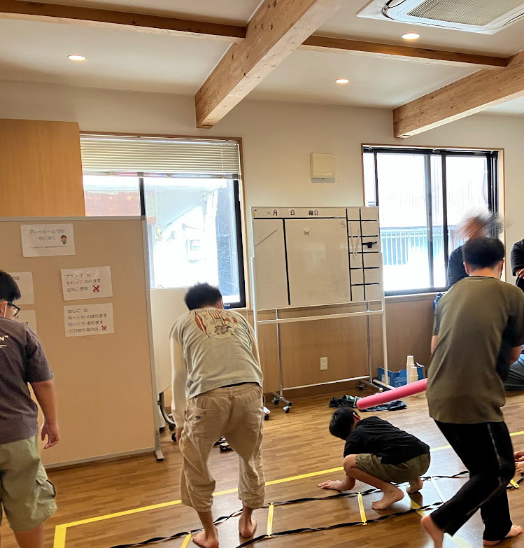 先日、ラダー遊びとしてラダーに沿って一列に並び、職員の動きを真似してジャンプする活動や棒の動きに合わせてしゃがんだり、ジャンプする活動を行いました。