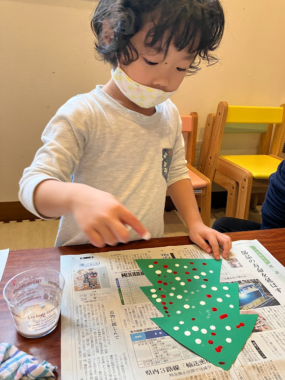 年長、年中さんはクリスマスツリーに赤、青、黄色、白の絵の具を使い、指でそれぞれ自分の好きな模様を描きました!