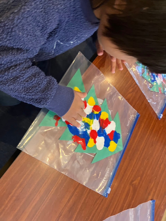 年少さんは汚れないフィンガーペイントとしてジップロックに赤、青、黄色、白の絵の具をつけたクリスマスツリーを入れ、袋の上から模様を描きました⛄