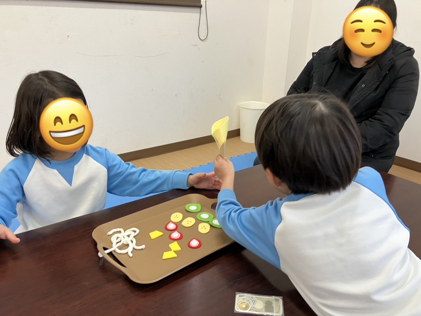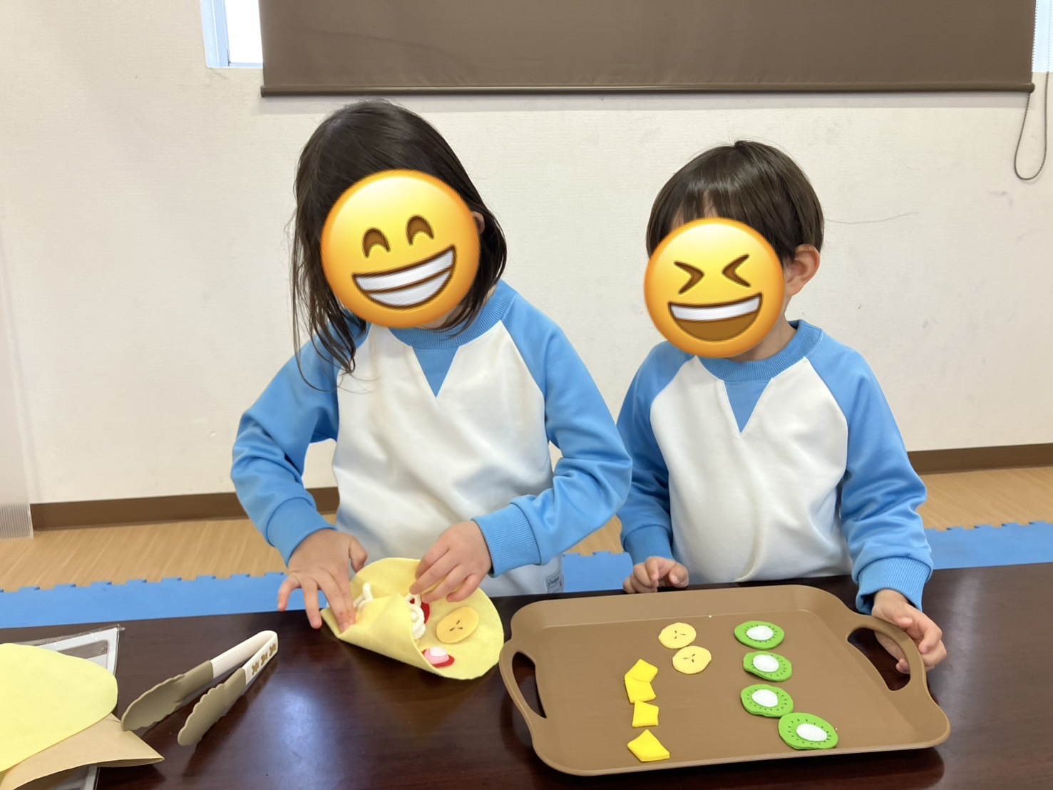 今日はクレープ屋さんになりきり、お客さんから言われたフルーツを生地にのせたり、生地を丸めて袋に入れて提供したりしましたよ🍓✨