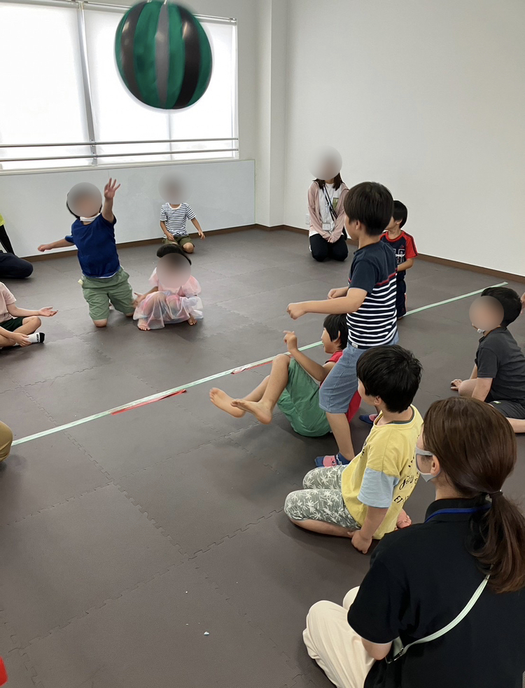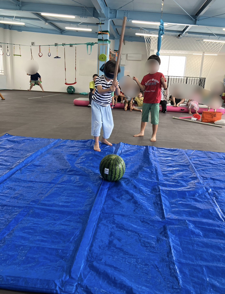 ビーチボールをスイカ柄にデコレーションしてのスイカバレーは、皆座った状態で体格差をなくして参加してもらいました✨