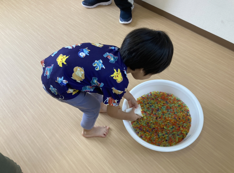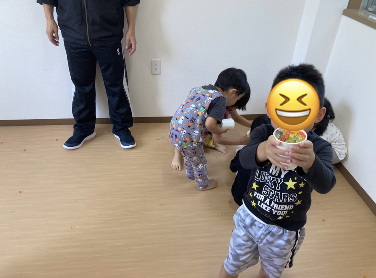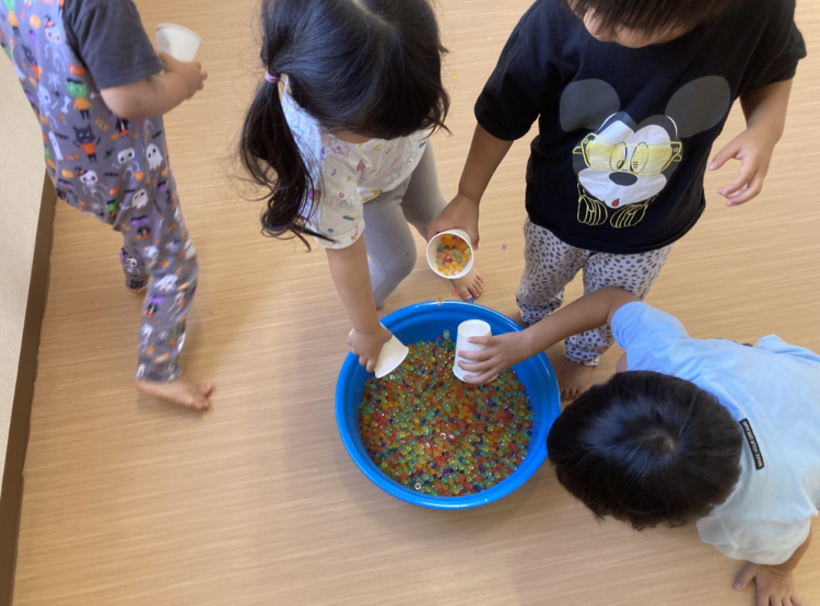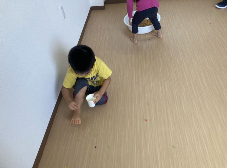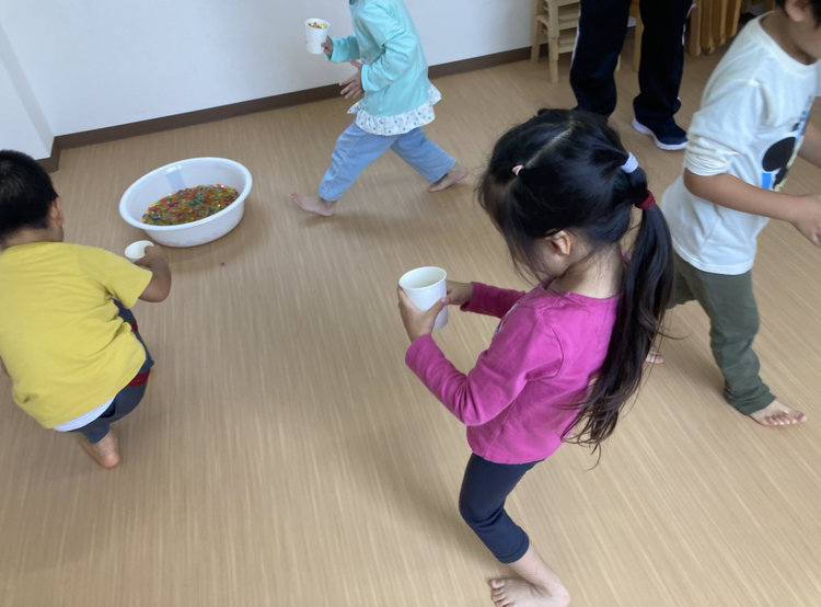 お友だちと協力して、タライからタライへ一つ残らず移したらOK‼️