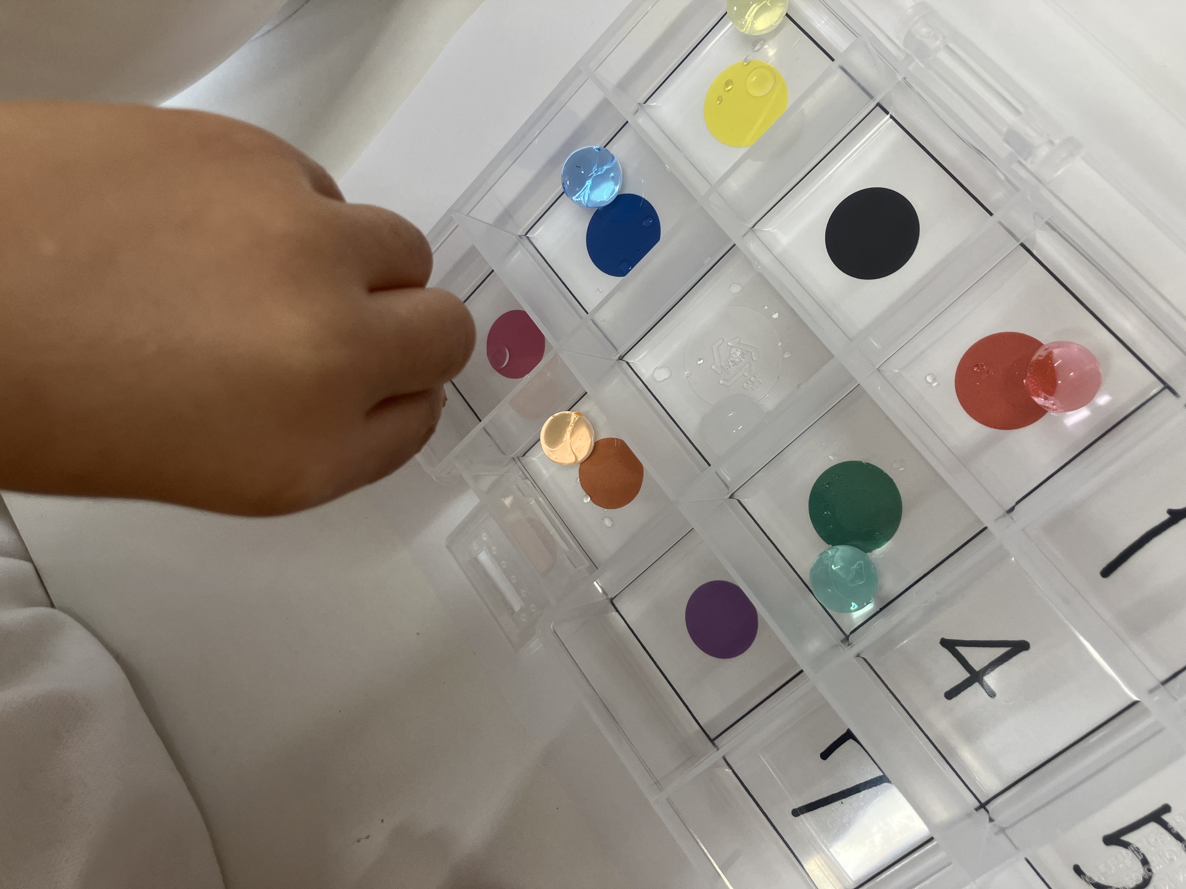 色分けしたマスと、数字がかかれたマスを用意し、色探しや数分け遊びをして楽しみました🔢✨