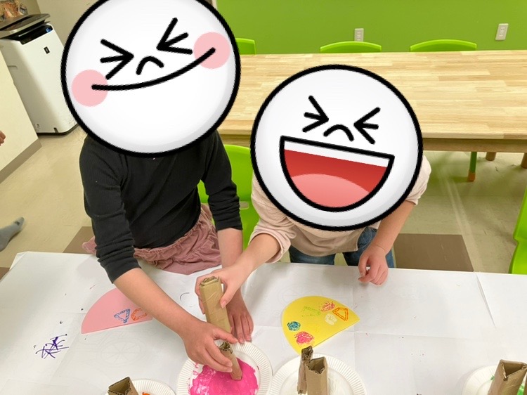 次に、ダンボールスタンプをして模様をつけていきました✨