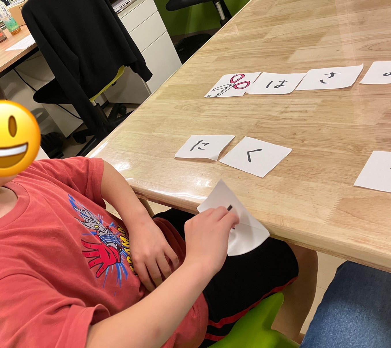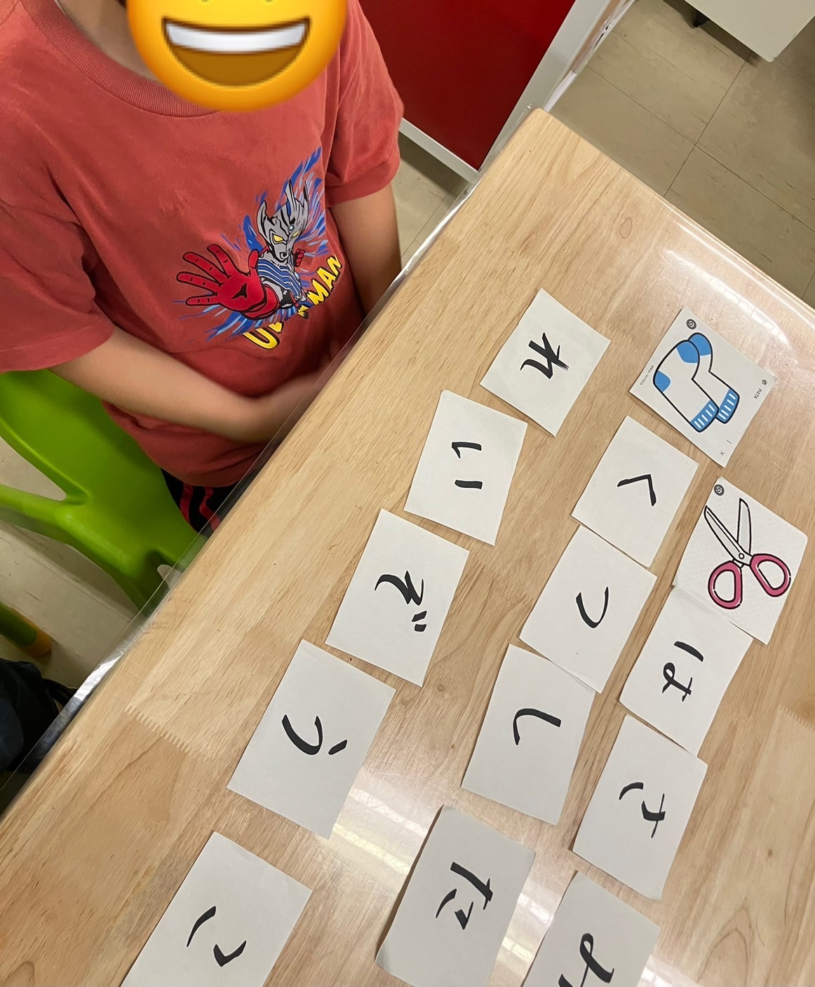 机の上にひらがなのカードをランダムに並べ、何の言葉なのかを当てるゲームです。