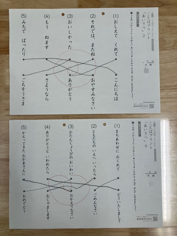 どんな場面でどんな挨拶をするのか、またどんな言い方や表情で行うと素敵なのかを、お話とプリントで順を追って確認をしていきました。