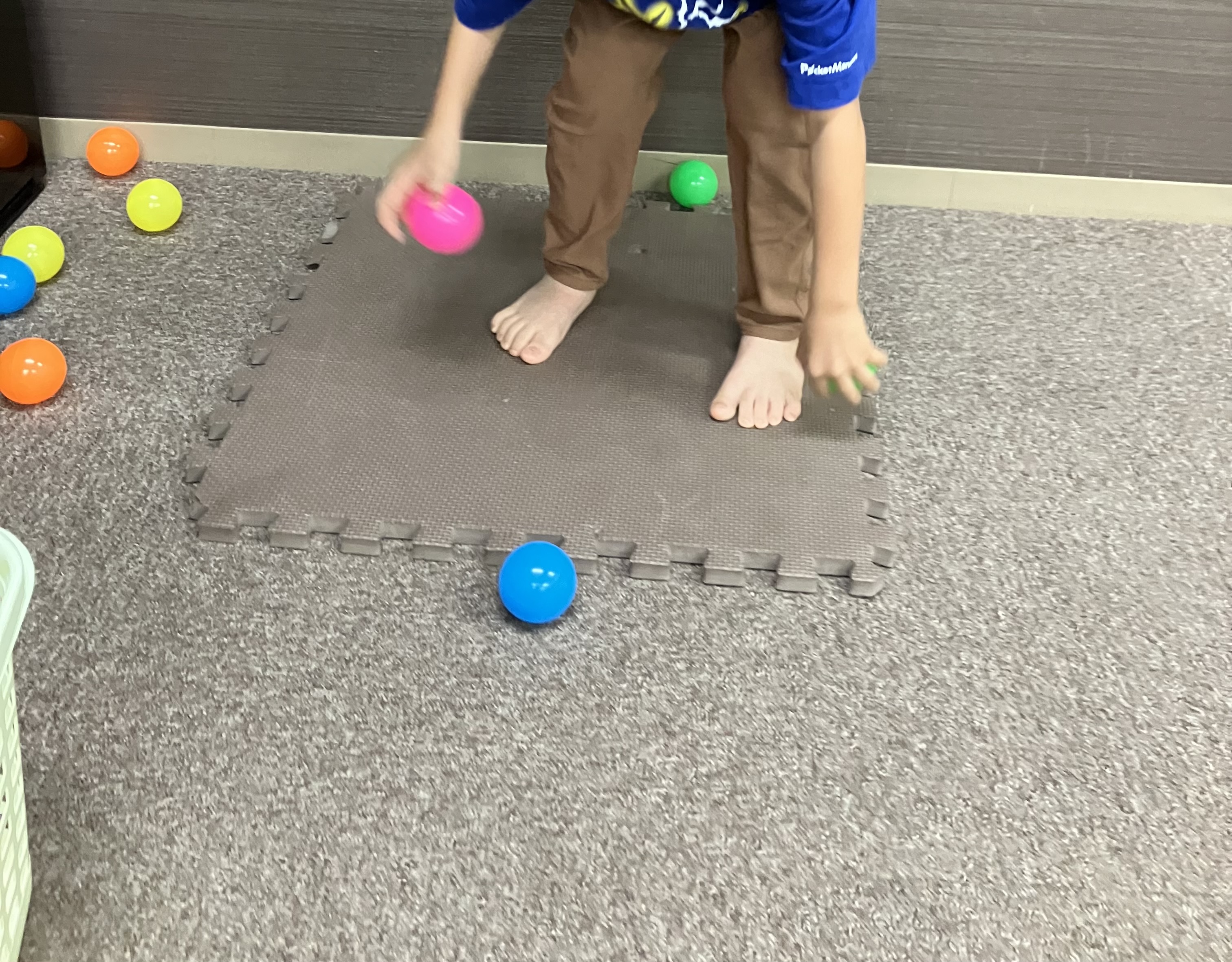 マットの上に立ち、飛んでくる色ボールを避けます。指定された色のボールが飛んできた時だけ手でキャッチします👏