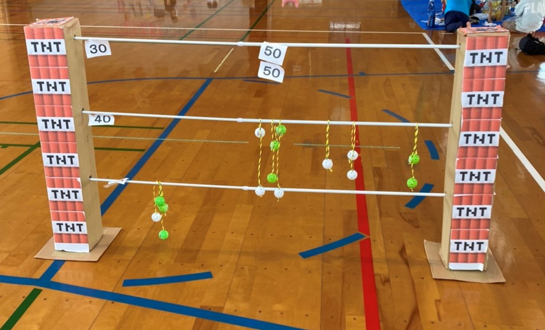 ・かごにシャトルを投げ入れるが距離が遠いが点数が高いもの(ひとつ20ポイント)、距離が近いが点数が低いもの(10ポイント)とを設定する