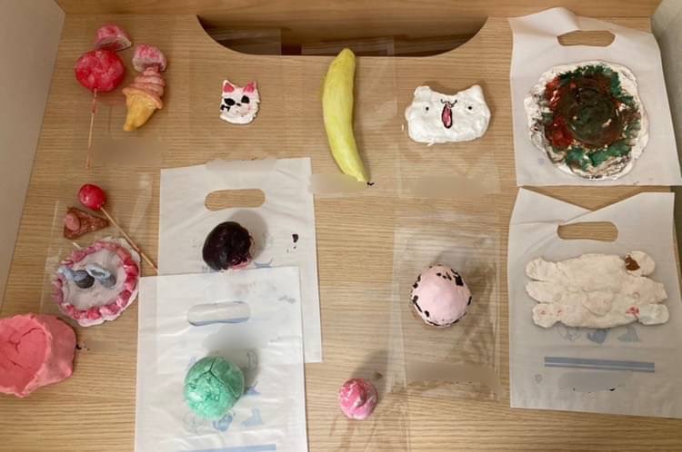 捏ねたり、伸ばしたり、力を込めて握ったり、感触を楽しんだ後は絵の具で色付けをして作品を作りました😊