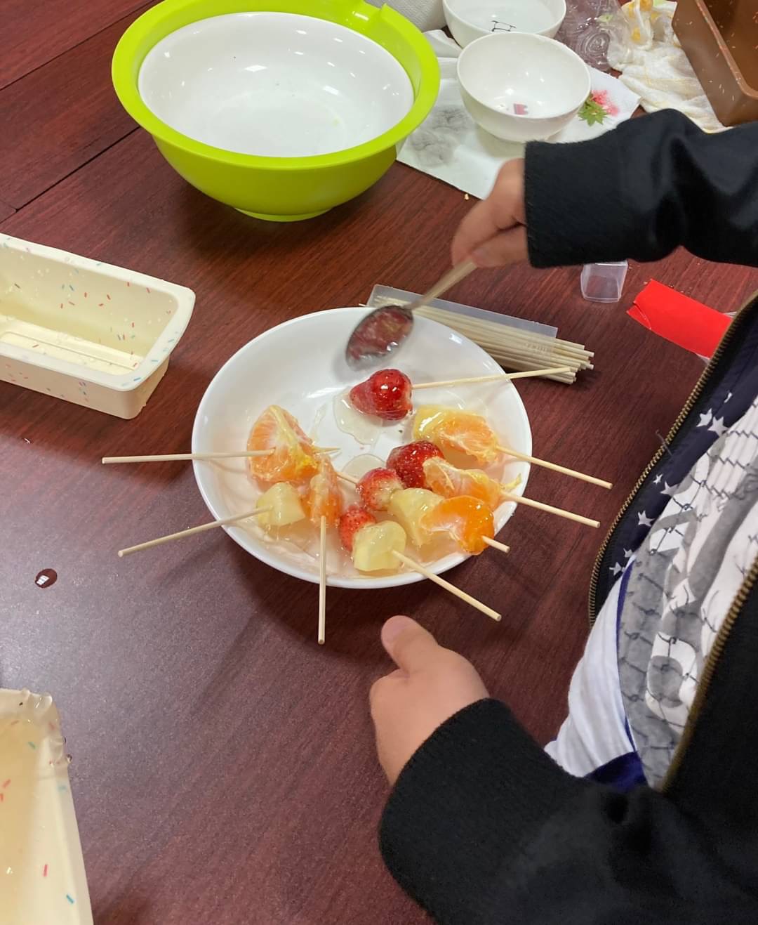 「ジュワッてなった!」と果物に飴をかける時になる音にも注目しながらフルーツ飴作りを楽しんでいました😊