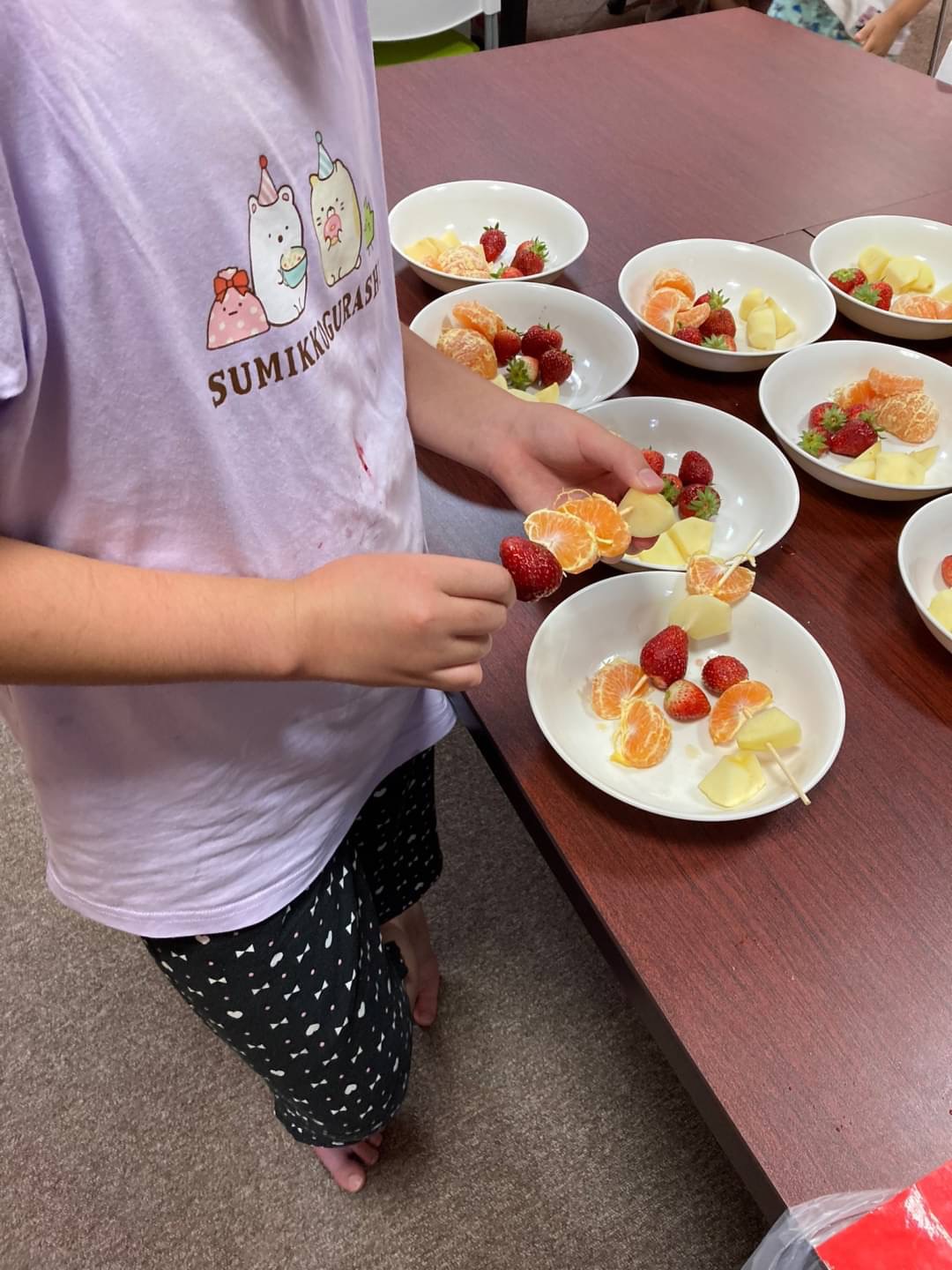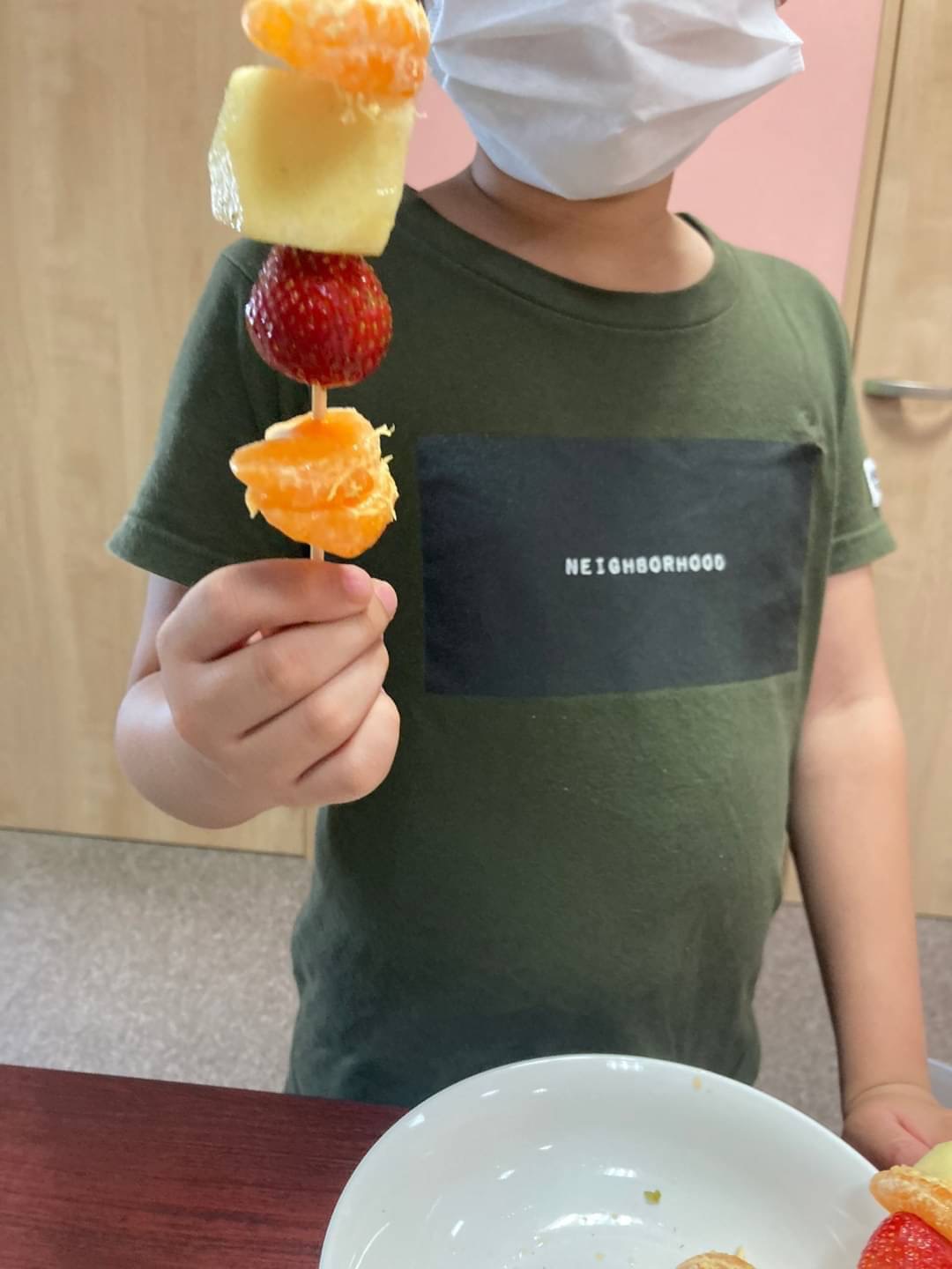 果物の種類ごとに刺したり、3種類の果物を上手に配置してカラフルにしたり😎