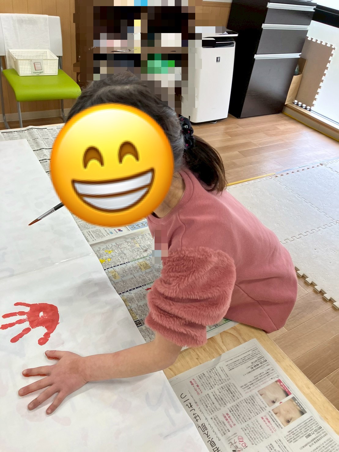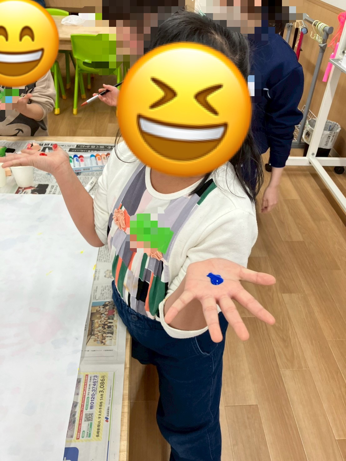 次に、大きな模造紙に筆や手、スタンプで絵の具遊びをしました🎨様々な色を混ぜて楽しむ様子が見られました☺️